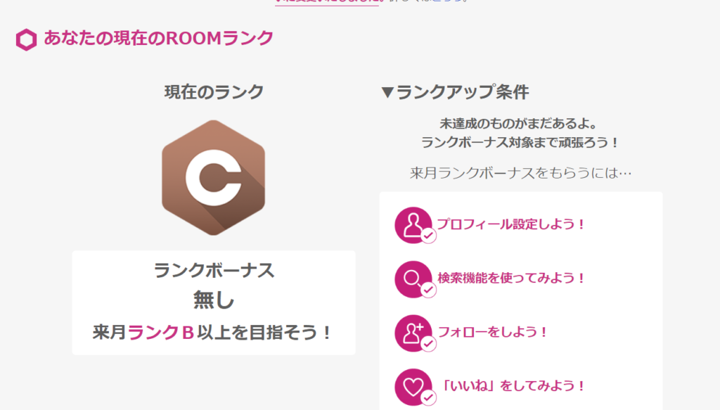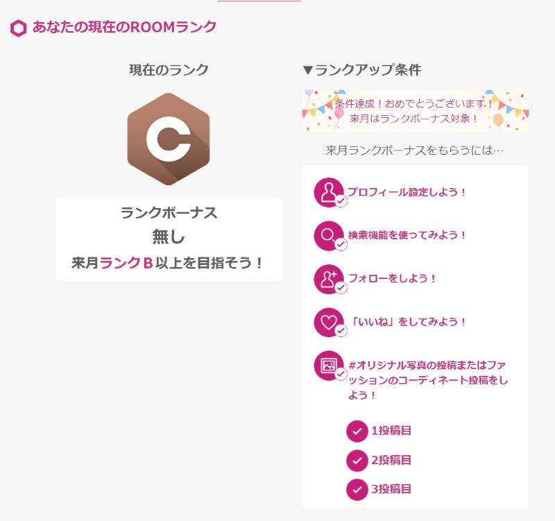 my ROOMの右上の をクリックして、はじめての方へをクリックして、ランク・報酬 >を確認してみてください。